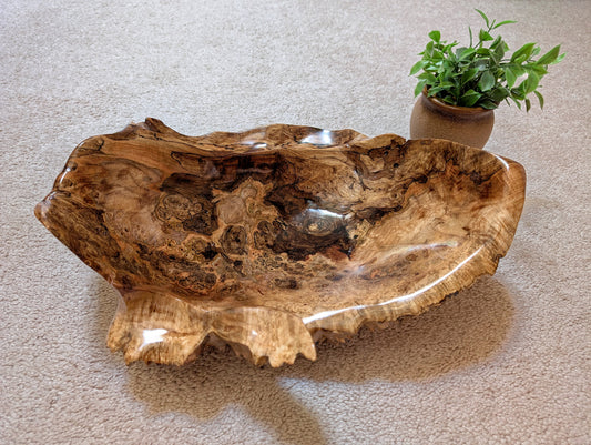 Exotic branched wood root bowl, 14.75'' T, x 21.5, large, smooth, rustic refined, twisted, arced, sprawling, one of a kind, unique, maroon, brown gold, obsidian rock floor inside, Wabi Sabi, driftwood, fruit bowl, food safe, beautiful, 369-A
