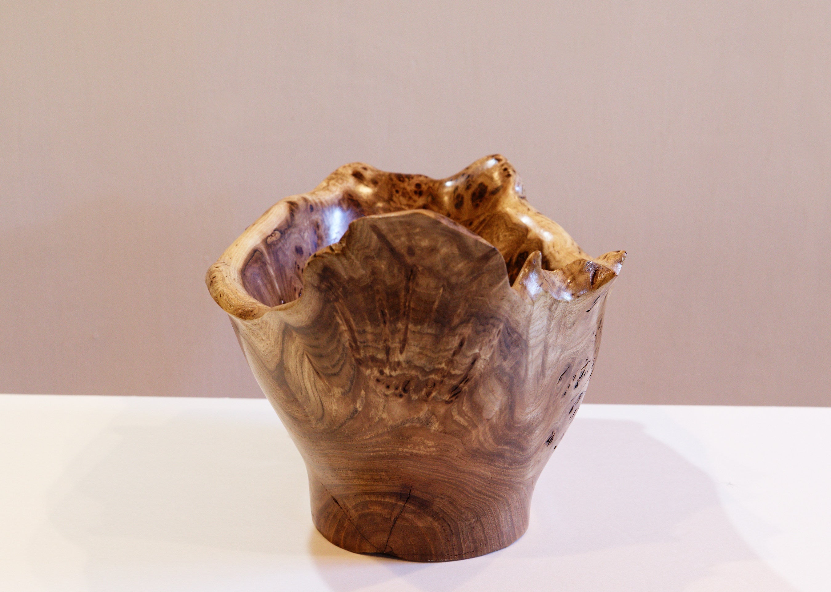 exotic Siberian black elm wooden bowl with many burl grain patterns and a free flowing shape, 8.25 inches Tall x 14 long x 8.5, 3.0 lbs., live edge