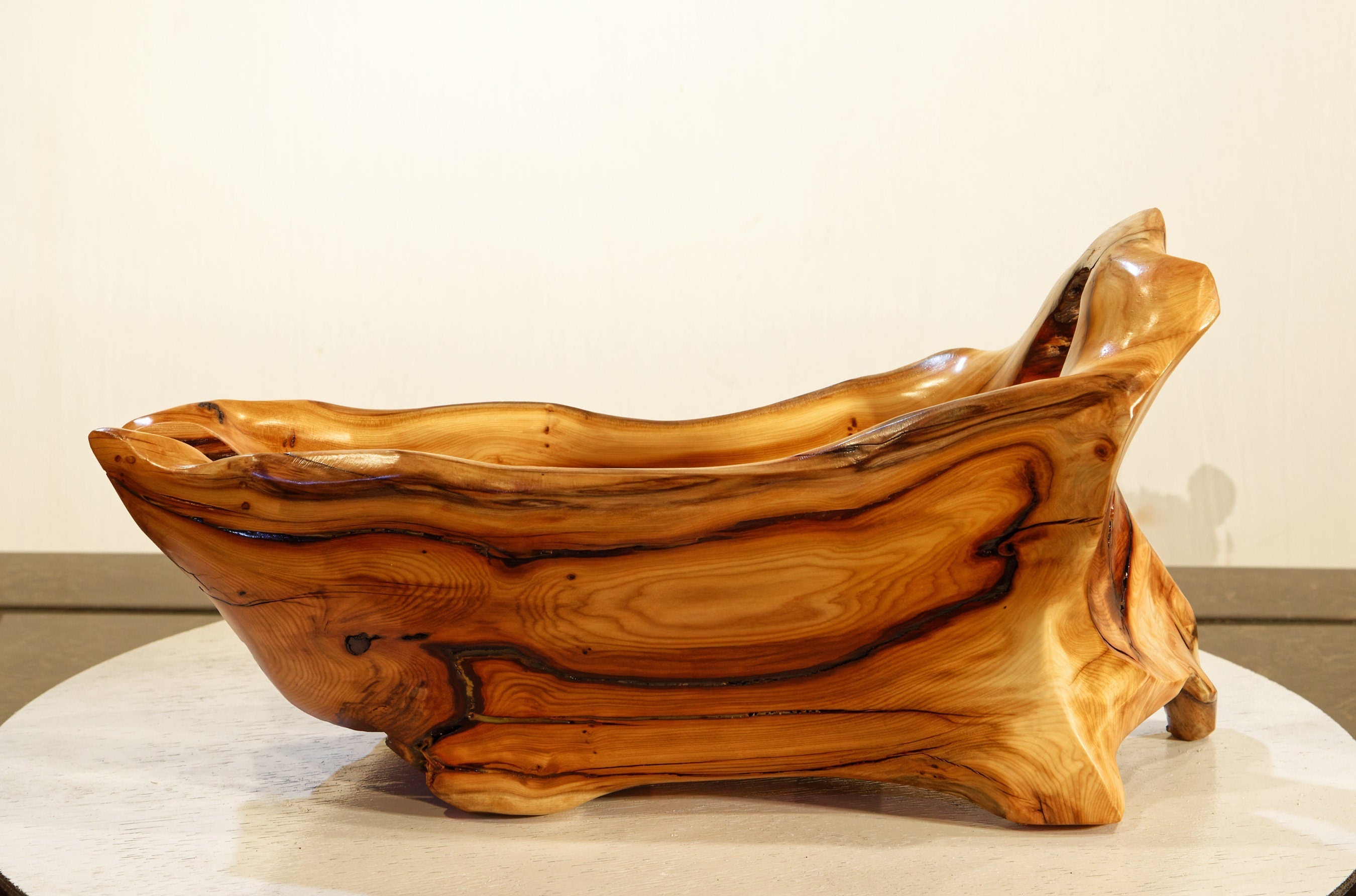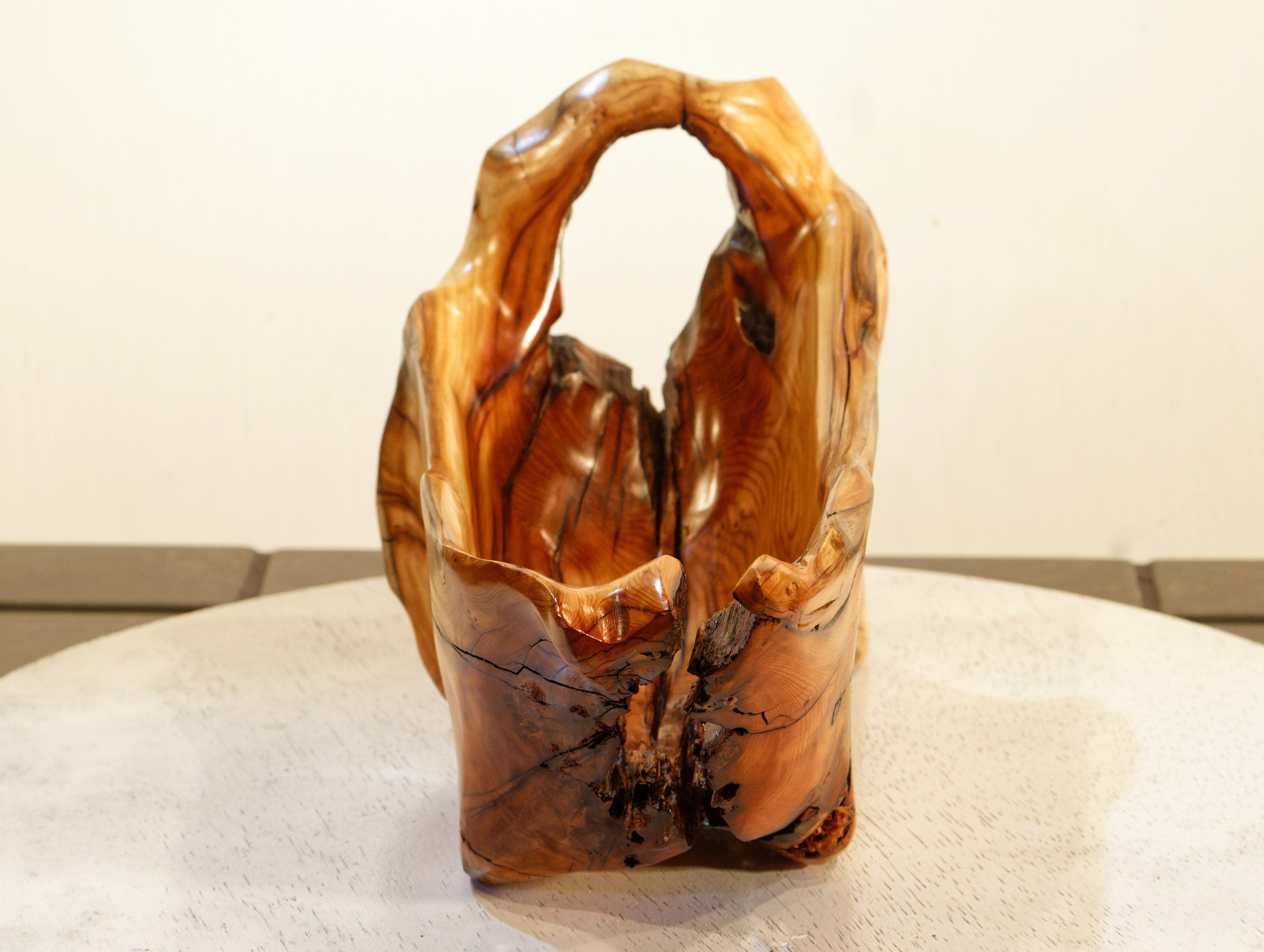 This unique, one-of a kind wine holder (with a unique bow handle) or catchall bowl is smooth and soft with beautiful grain patterns. It measures 14 inches long x 6 x 7 tall, and weighs 3.71 Lbs. Wine not included.