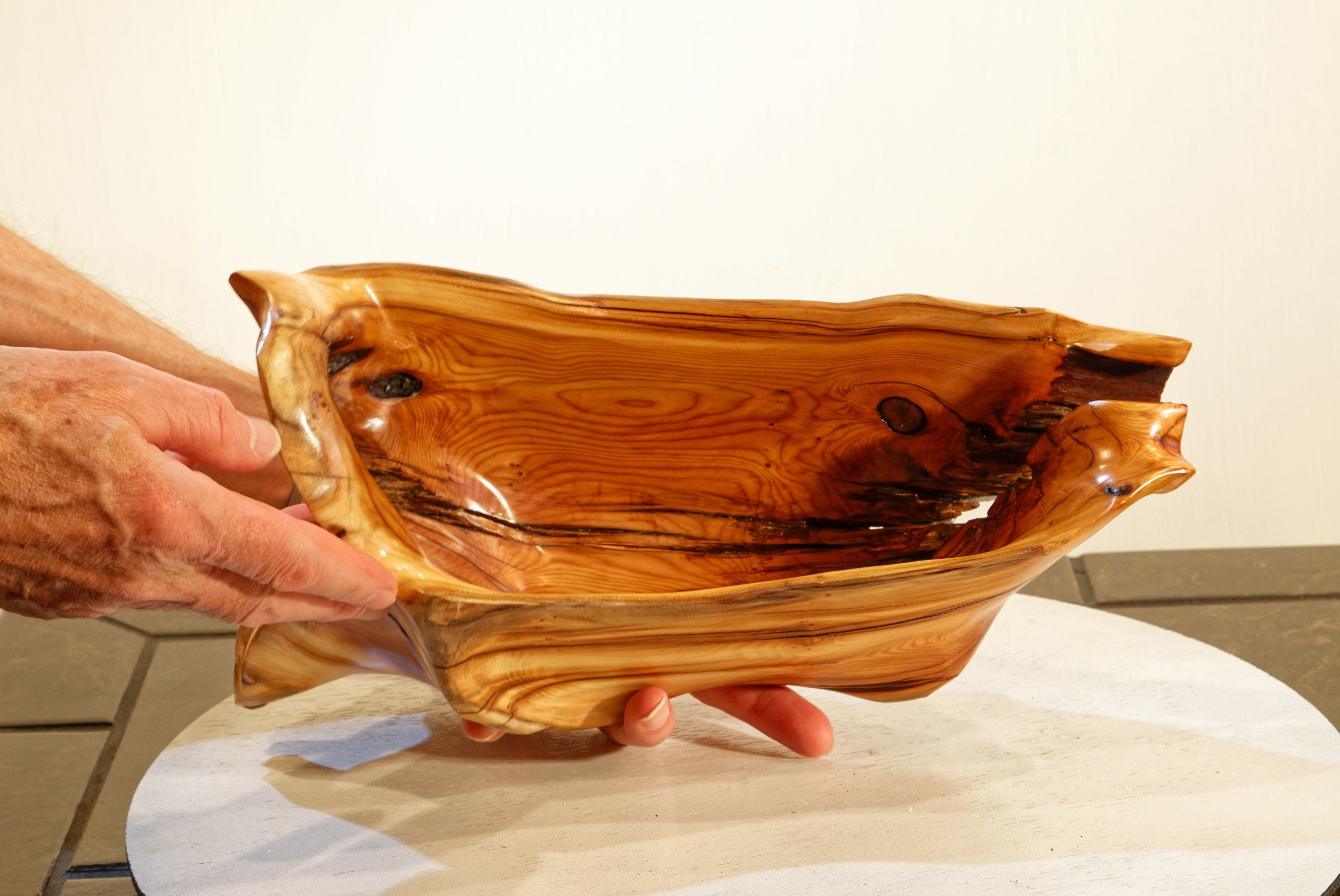 … A smooth, satin, oil based varnish-like finish protects this bowl's outside and a food safe odorless and tasteless mix of special oils and waxes protects the inside so it can hold and display anything but liquids or very moist items.