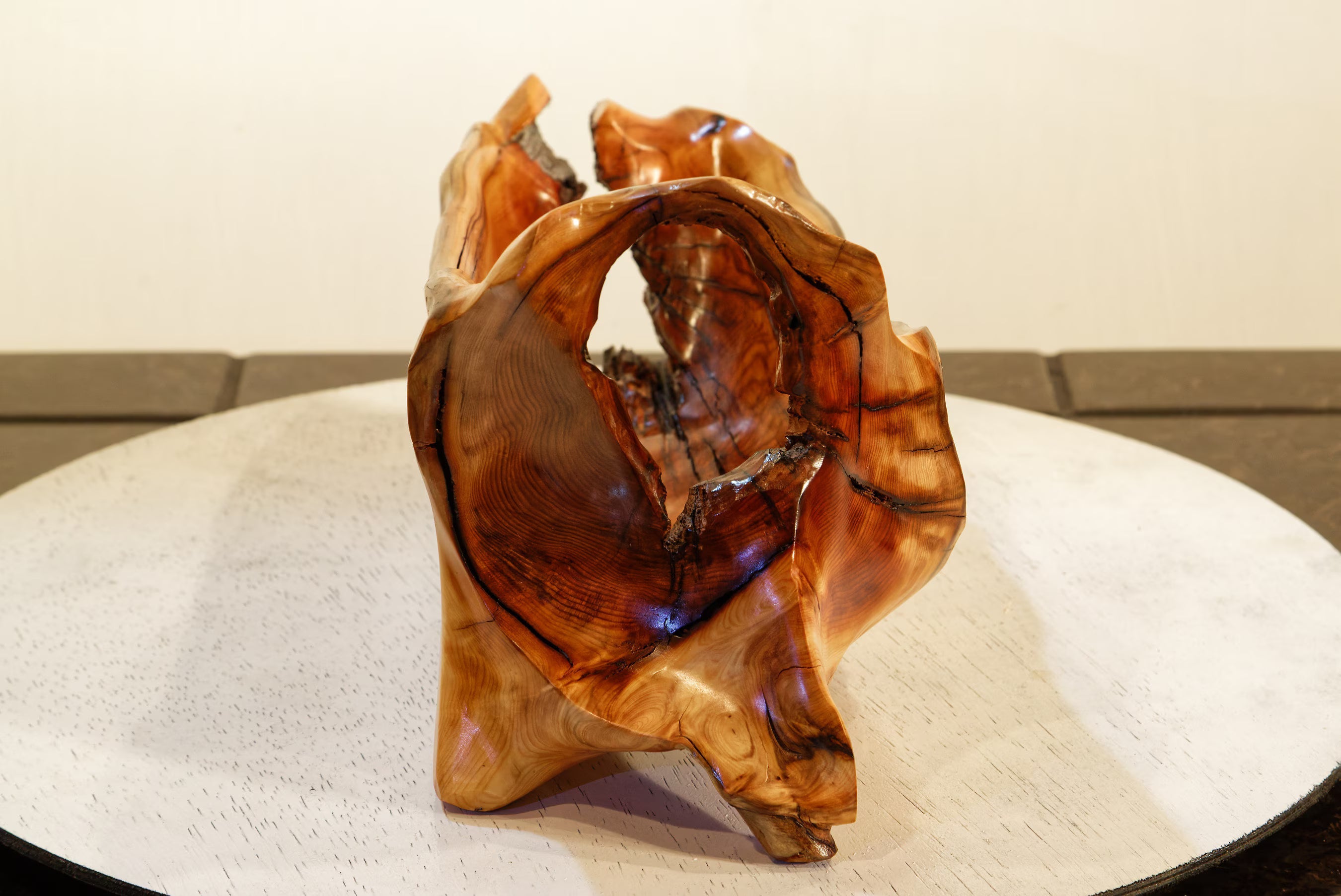 2. The wood for this sculpture was cured until it reached a moisture content similar to most homes. In some pieces, natural cracks have been filled and others have been incorporated into the sculpture's design. Occasionally, over time, more may form because additional drying can occur since residential and office humidity levels vary considerably.