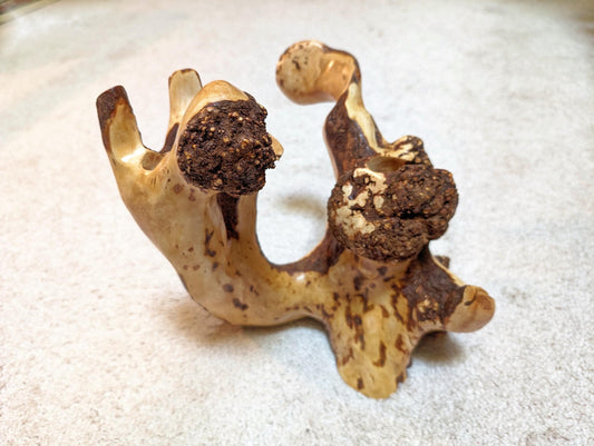 Exotic branched wood root bowl, 14.75'' T, x 21.5, large, smooth, rustic refined, twisted, arced, sprawling, one of a kind, unique, maroon, brown gold, obsidian rock floor inside, Wabi Sabi, driftwood, fruit bowl, food safe, beautiful, 369-A