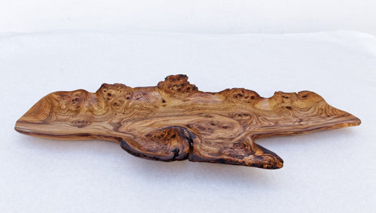 irregular wood platter, wall hanging, tabletop sculpture, exotic burl, live edge bark, 1.75 inches tall x 21.5 x 10.2 wide, Wabi Sabi 312-ZF