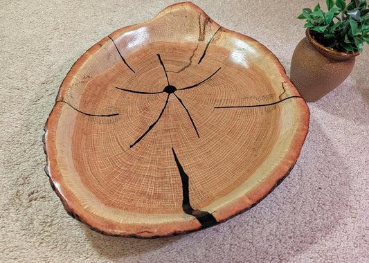 red oak platter, wood, serving tray, live edge, bark, beautiful grain, ornate round, 4" tall x 17.38, Wabi Sabi, one-of-a-kind, 568-Z11