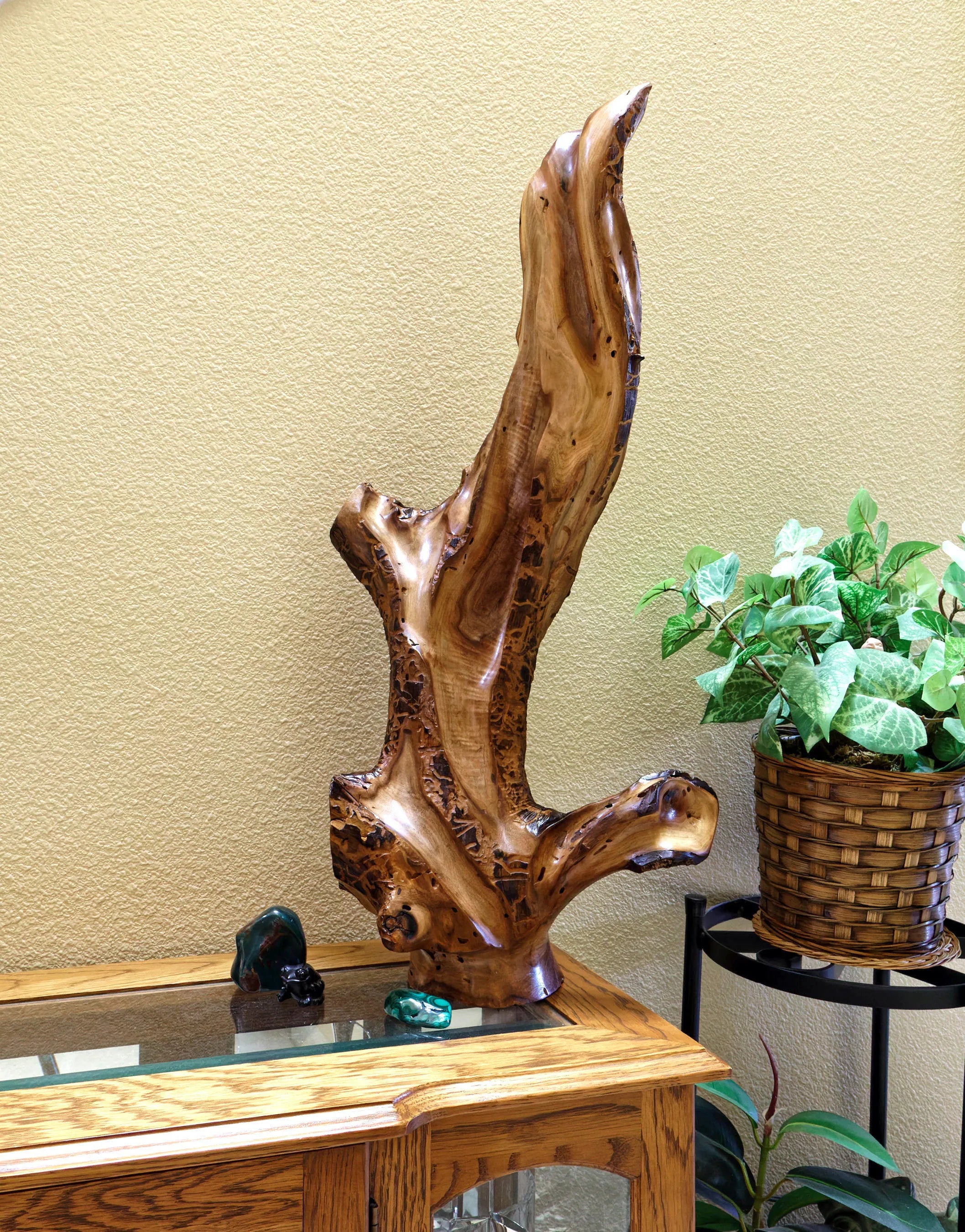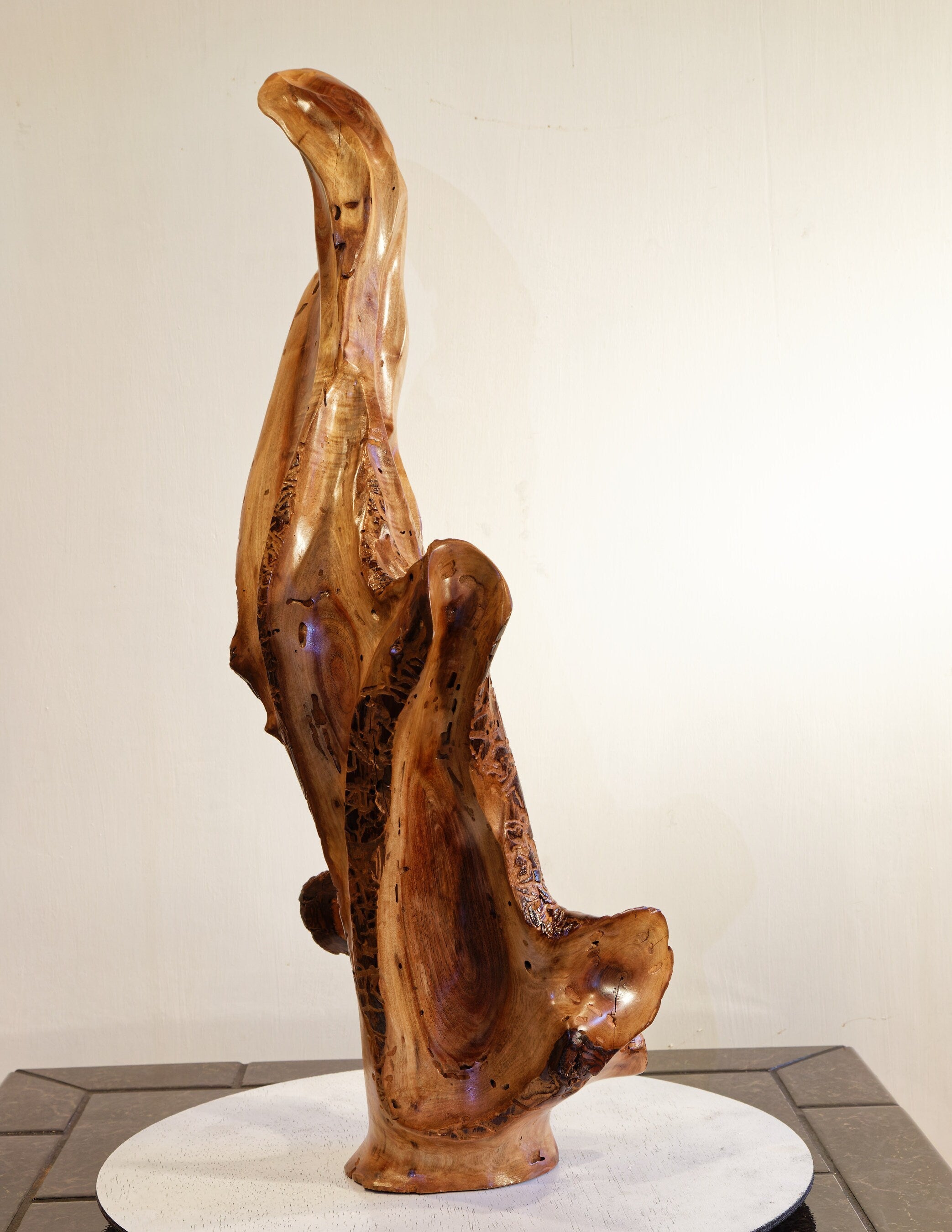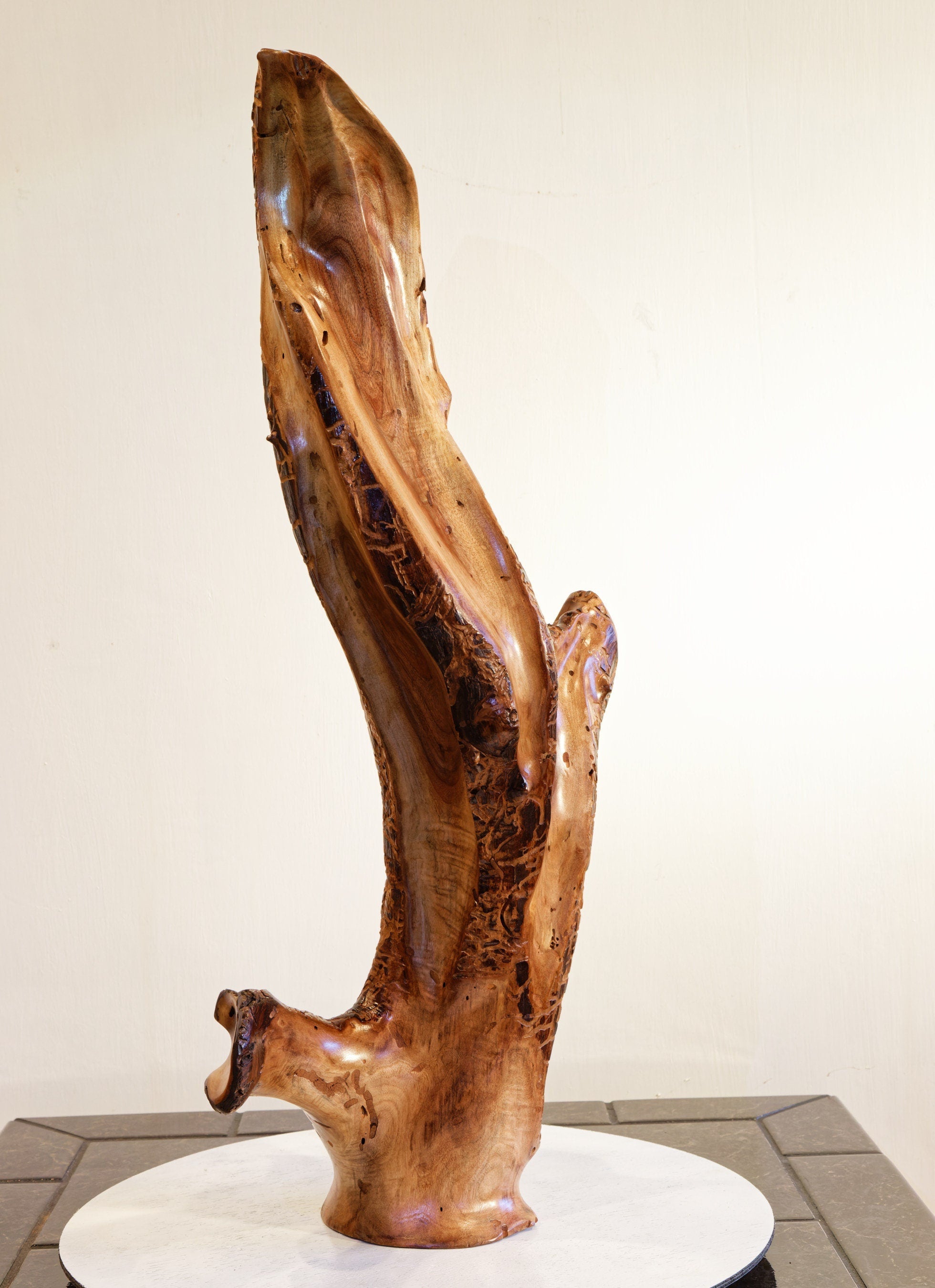 2. The wood for this sculpture was cured until it reached a moisture content similar to most homes. In some pieces, natural cracks have been filled and others have been incorporated into the sculpture's design. Occasionally, over time, more may form because additional drying can occur since residential and office humidity levels vary considerably.