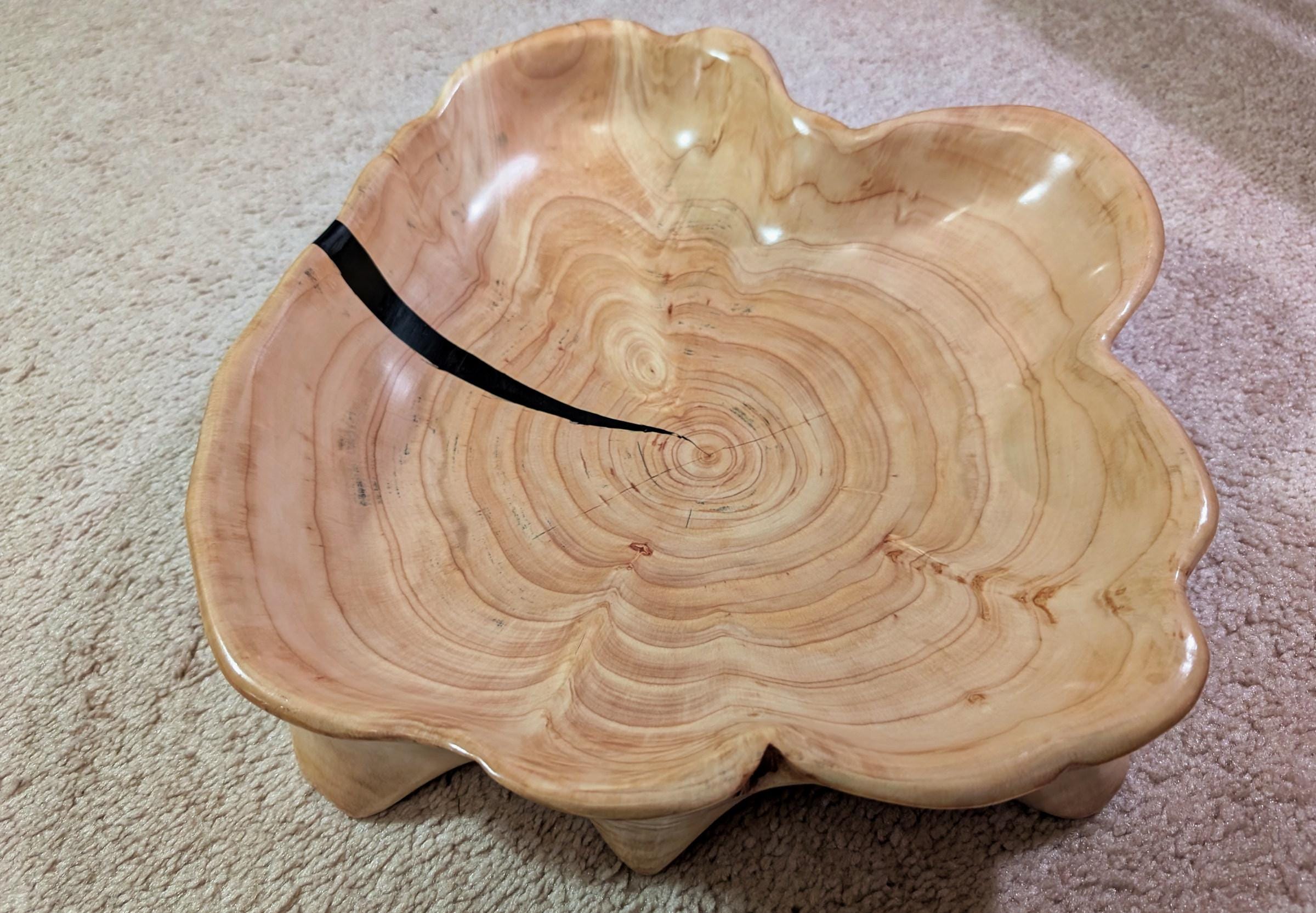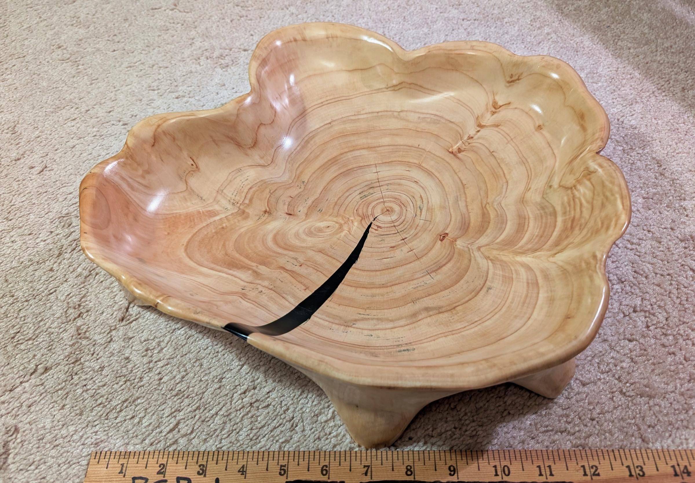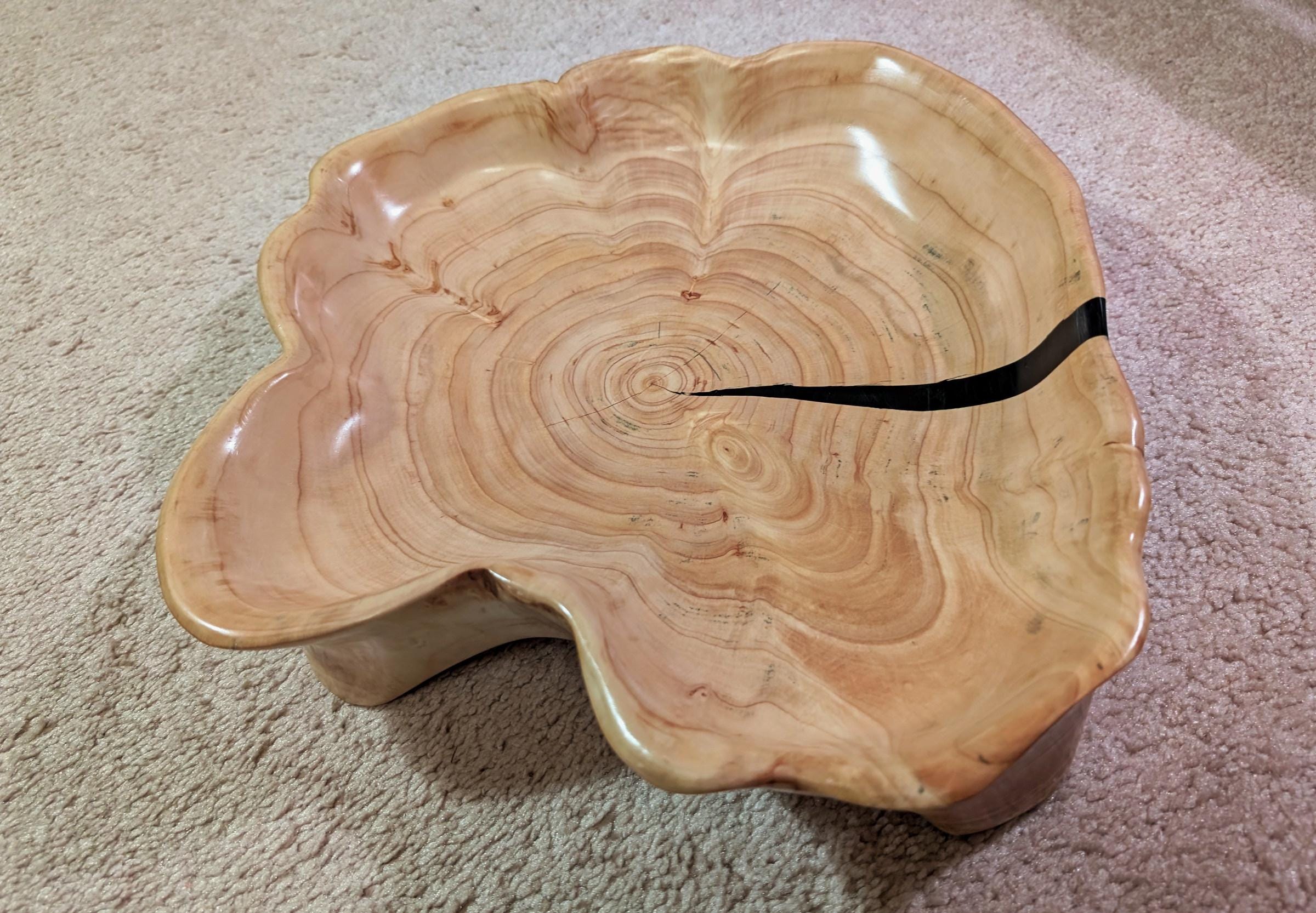 This unique, one of a kind one-of-a-kind Leyland cypress bowl / platter / serving tray has a scalloped, irregular, round shape, is golden tan and has smooth, soft, beautiful figured grain patterns. It measures 3 inches tall x 15 x 13'', 2.8 lbs. It includes a black epoxy accent stripe.
