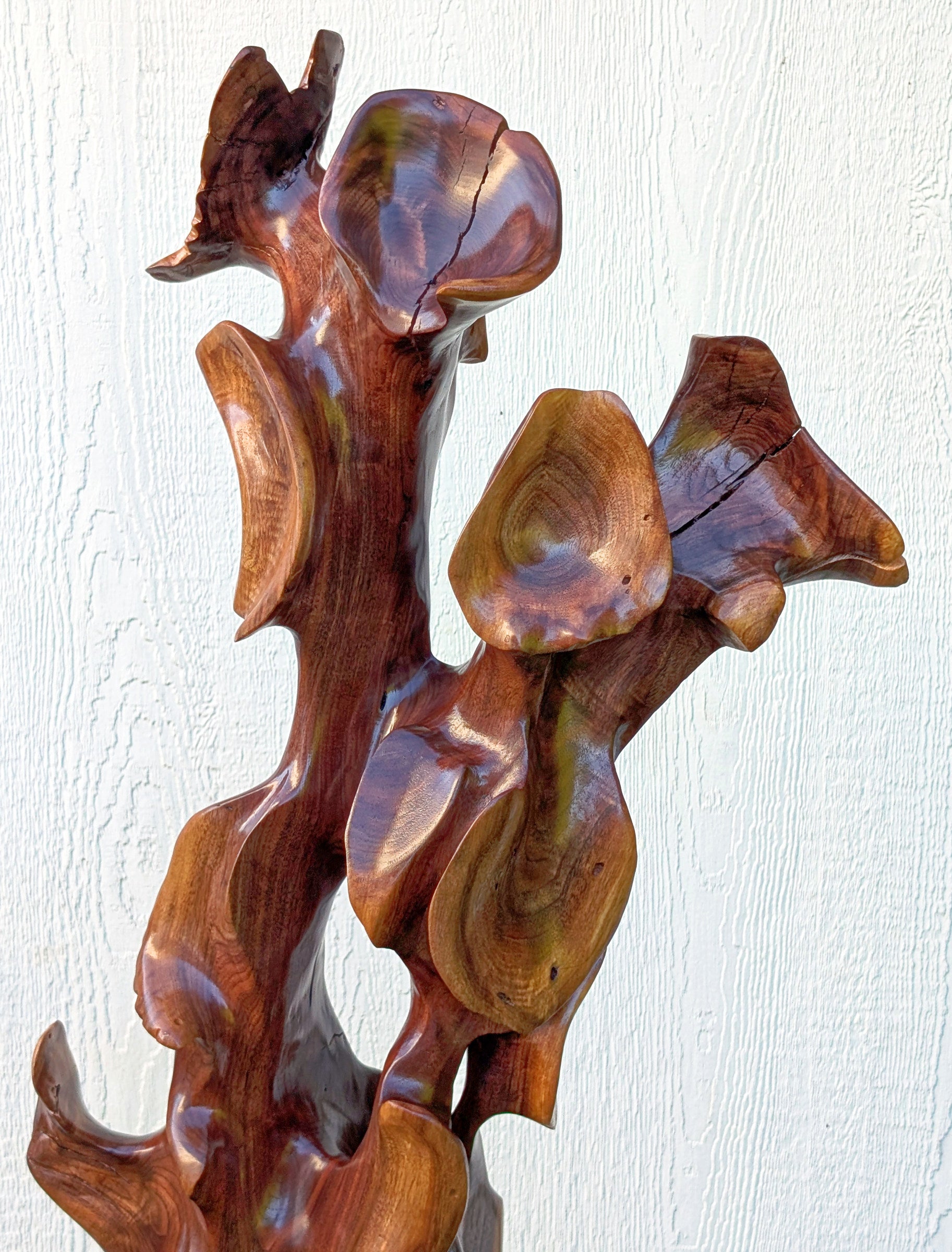 This elegant freestanding freeform, one-of-a-kind floor sculpture (which I call Uplifting) began as a standing dead black walnut tree that had to be removed to enable a road widening in Milwaukie, Oregon. Its reddish-brown color enhances the flared and twisted wings / projections that make the sculpture so unique. The sculpture is 64.25'' tall x 17" x 15.5" (37.8 lbs.) and has a removable base to make it cheaper to ship.