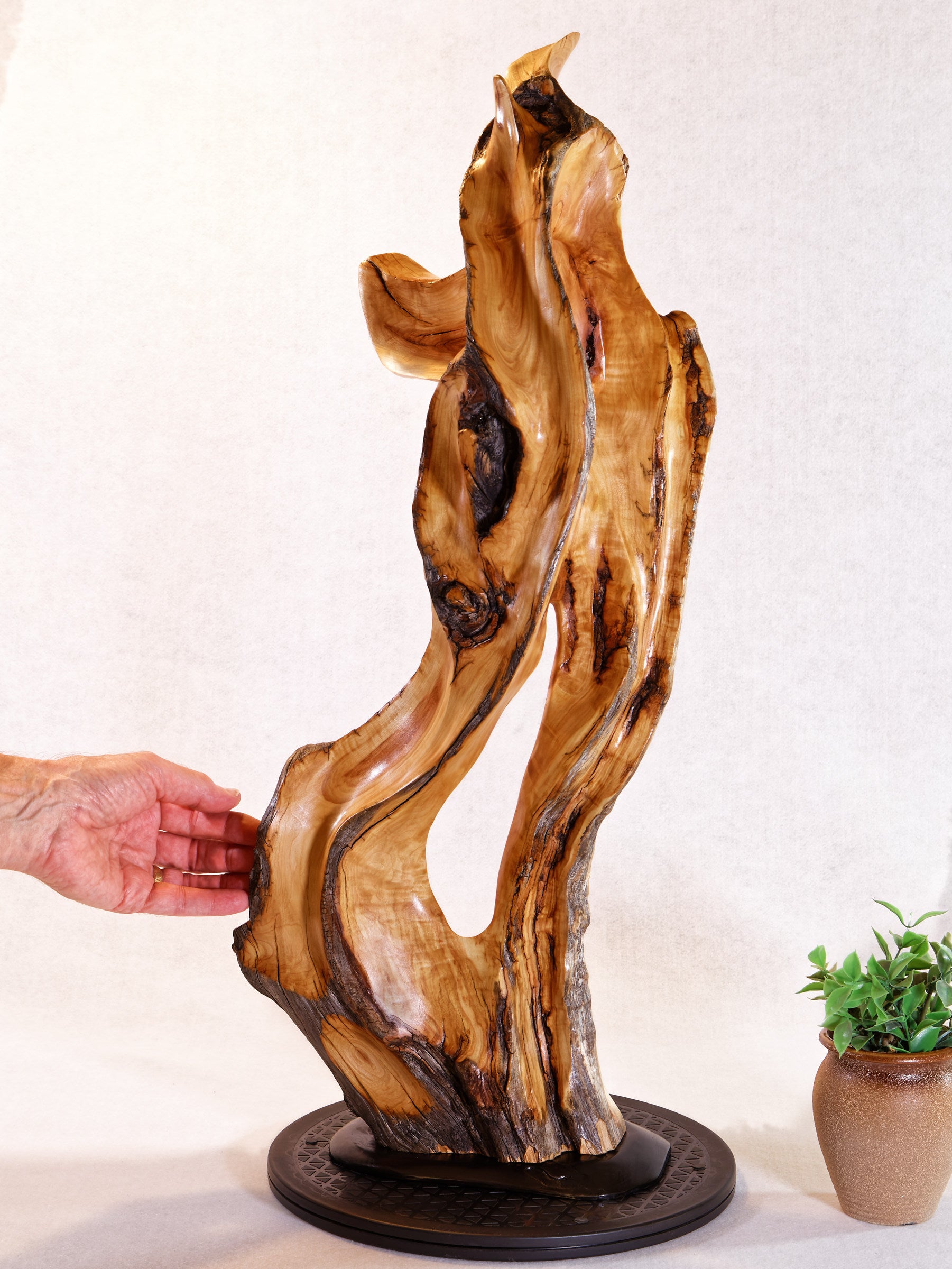 2. The wood for this sculpture was cured until it reached a moisture content like that in most homes and offices. Some natural cracks have been filled and others have been retained to enhance the sculpture's design. Occasionally, over time, cracks may change since indoor humidity levels vary considerably and cause wood to expand or contract.